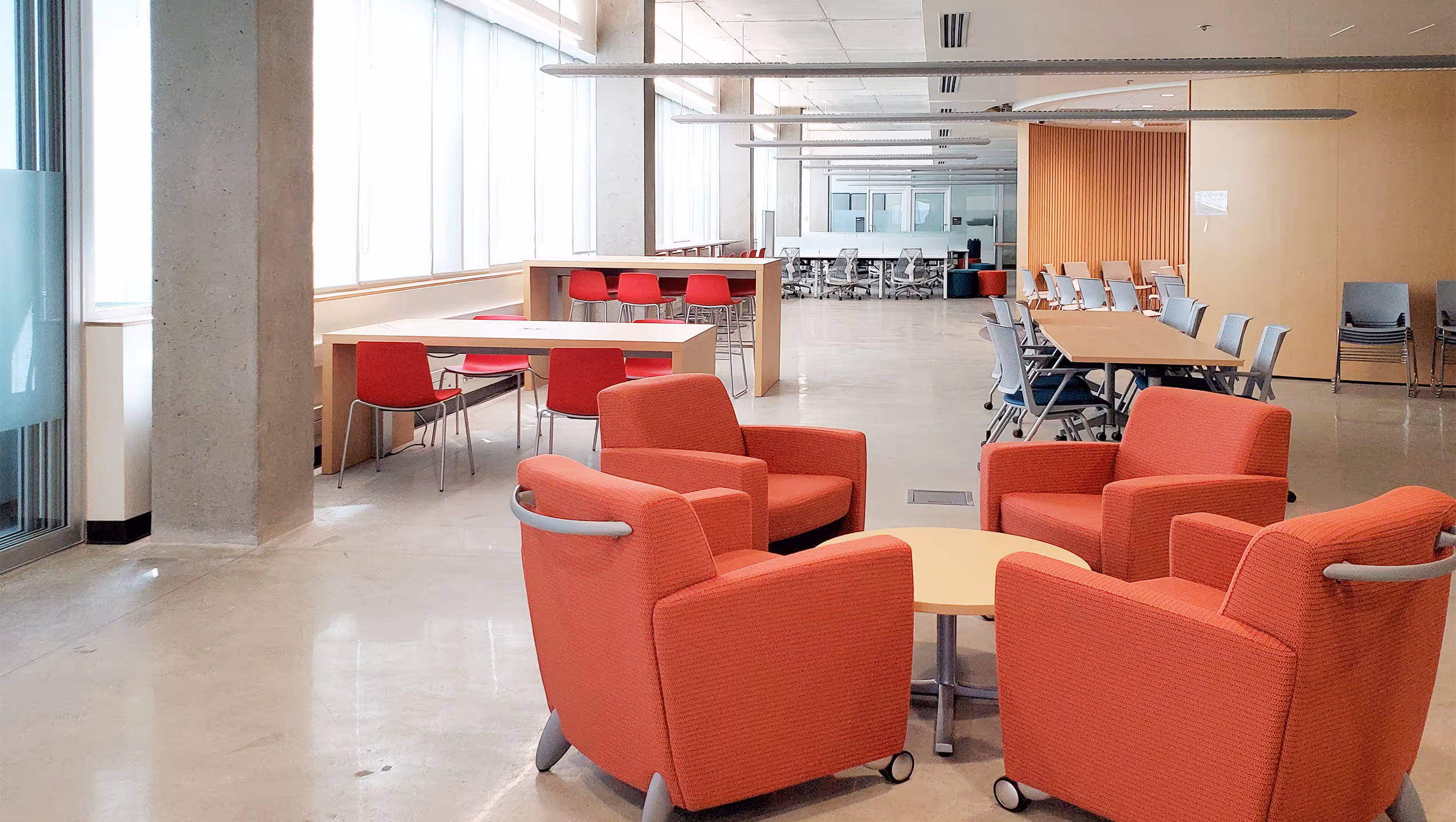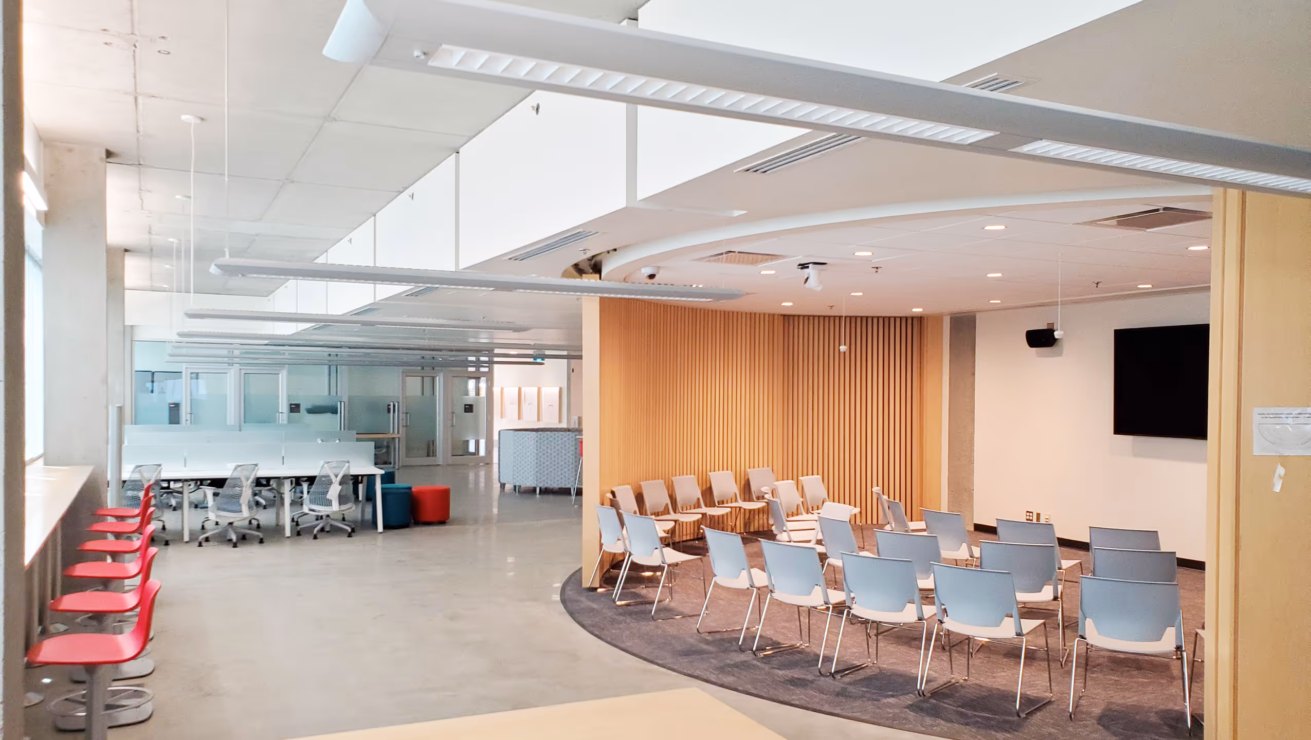 The renovation converted an underutilized section of Level 10000 into presentation zones, study spaces, breakout rooms, and social areas designed to foster engagement and community-building. The design supports flexible teaching formats, informal gatherings, and a more connected student experience within one of SFU’s core academic buildings. WEE provided the complete electrical design for the renovation, including new lighting systems, power distribution, and full life-safety integration. Our team also coordinated electrical interfaces for IT and AV infrastructure to support technology-enabled study and presentation environments.
