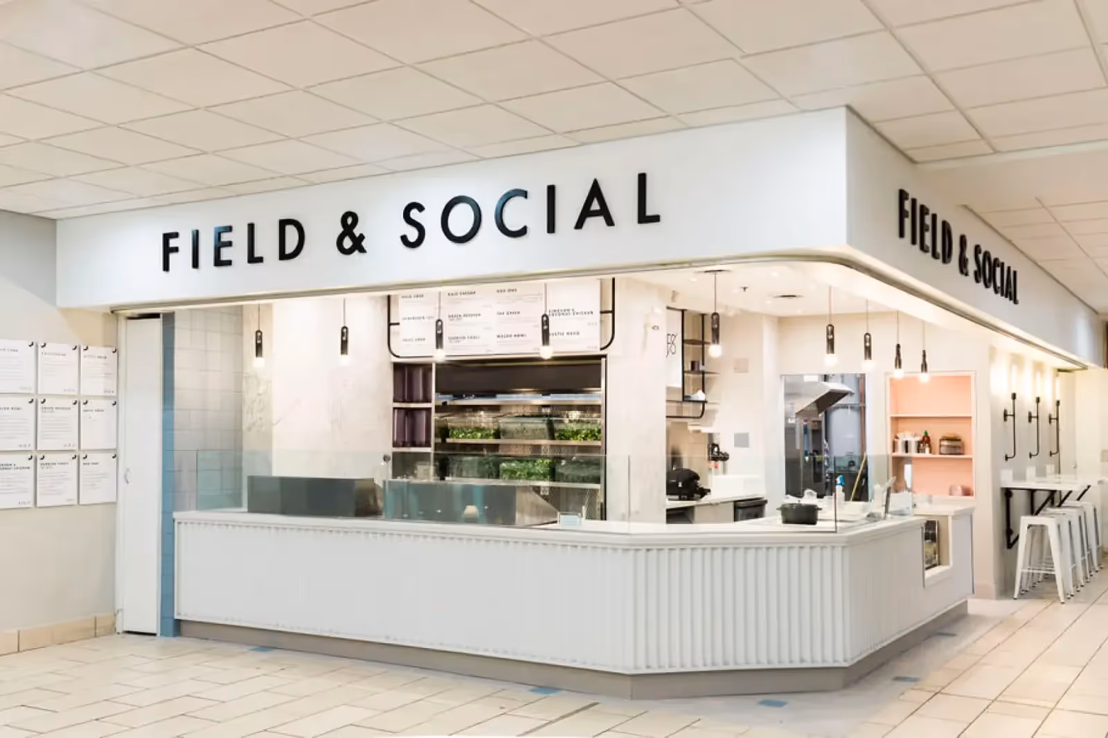 Interior of a spacious wooden building with a large staircase, metal doors labeled mechanical room and restroom, and a blue upper section with windows.